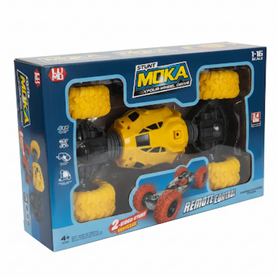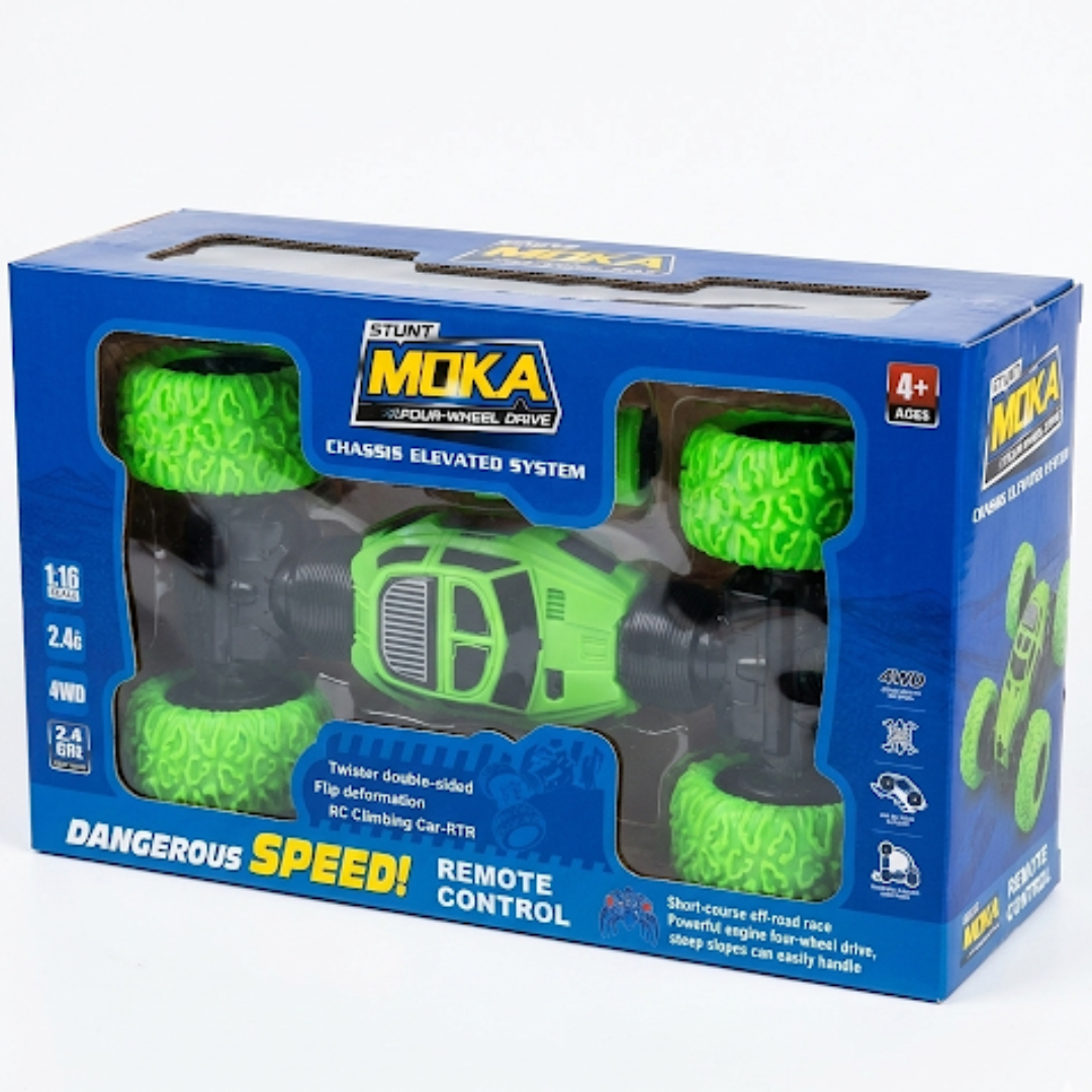 This car is packed with features for maximum fun: it drives on both sides, performs thrilling flips, and has a chassis elevation system to climb over obstacles easily. The 2.4 GHz control means you won't have any signal issues when racing against friends.
